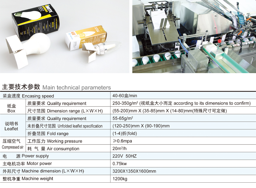 本產品是我公司結合國外包裝機的先進技術及根據目前照明、電子等行業的實際情況而研發的具有新型、先進的包裝機械設備,是機、電、氣、光一體化的高科技產品。本產品適用于照明、電子等行業各類球泡燈、蠟燭(尾)燈、筒燈、射燈、單端熒光燈、節能燈、鎮流器等等以及相類似物品的裝盒包裝。該機還具有自動完成使用說明書的折疊、紙盒自動打開、單邊內村自動上料、物品帶內襯和說明書-起自動裝盒、封盒等功能。同時也是解決目前招工難、管理難而代替勞動力的先進自動包裝設備。該機可以單獨使用亦可以與其他設備聯動使用,形成成套生產聯動線。