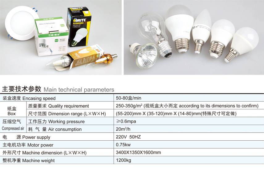 本產(chǎn)品是我公司結(jié)合國(guó)外包裝機(jī)的先進(jìn)技術(shù)及根據(jù)目前照明、電子等行業(yè)的實(shí)際情況而研發(fā)的具有新型、先進(jìn)的包裝機(jī)械設(shè)備,是機(jī)、電、氣光一體化的高科技產(chǎn)品。本產(chǎn)品適用于照明、電子等行業(yè)各類(lèi)球泡燈、蠟燭(尾)燈、筒燈、射燈、單端熒光燈、節(jié)能燈、鎮(zhèn)流器等等以及相類(lèi)似物品的裝盒包裝。具有將紙盒自動(dòng)打開(kāi)、物品裝盒、封盒等功能;同時(shí)也是解決目前招工難、管理難而代替勞動(dòng)力的先進(jìn)自動(dòng)包裝設(shè)備。該機(jī)可以單獨(dú)使用亦可以與其他設(shè)備聯(lián)動(dòng)使用,形成成套生產(chǎn)聯(lián)動(dòng)線(xiàn)。