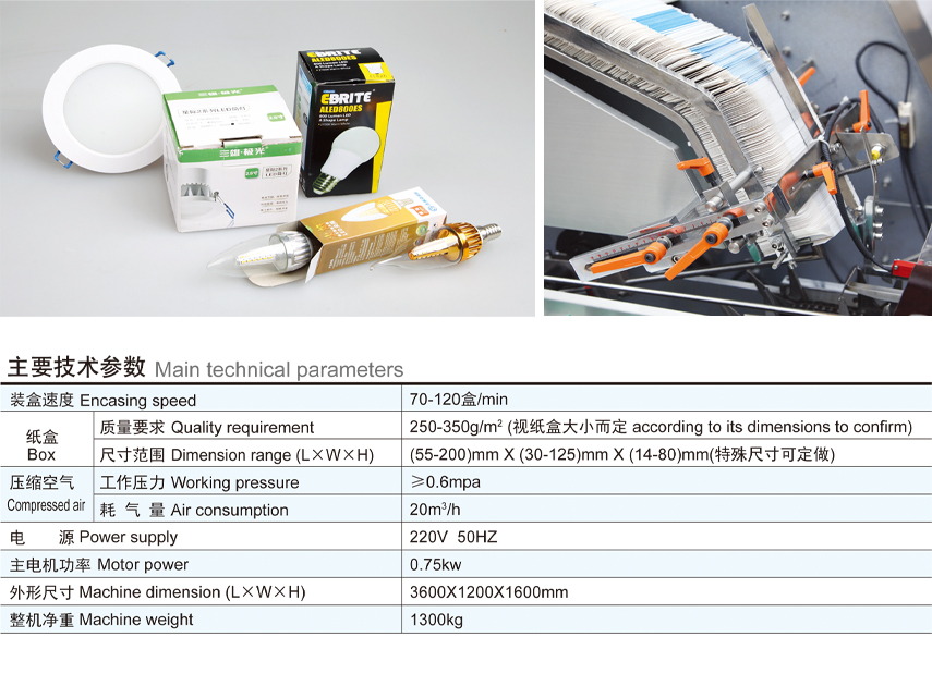 本產(chǎn)品是我公司結(jié)合國外包裝機的先進技術(shù)及根據(jù)目前照明、電子等行業(yè)的實際情況而研發(fā)的具有新型、先進的中速包裝機械設(shè)備,是機、電、氣光一體化的高科技產(chǎn)品。本產(chǎn)品適用于照明、電子等行業(yè)各類球泡燈、蠟燭(尾)燈、簡燈、射燈、單端熒光燈、節(jié)能燈、鎮(zhèn)流器等等以及相類似物品的裝盒包裝。具有將紙盒自動打開、物品裝盒、封盒等功能;同時也是解決目前招工難、管理難而代替勞動力的先進自動包裝設(shè)備。該機可以單獨使用亦可以與其他設(shè)備聯(lián)動使用,形成成套生產(chǎn)聯(lián)動線。